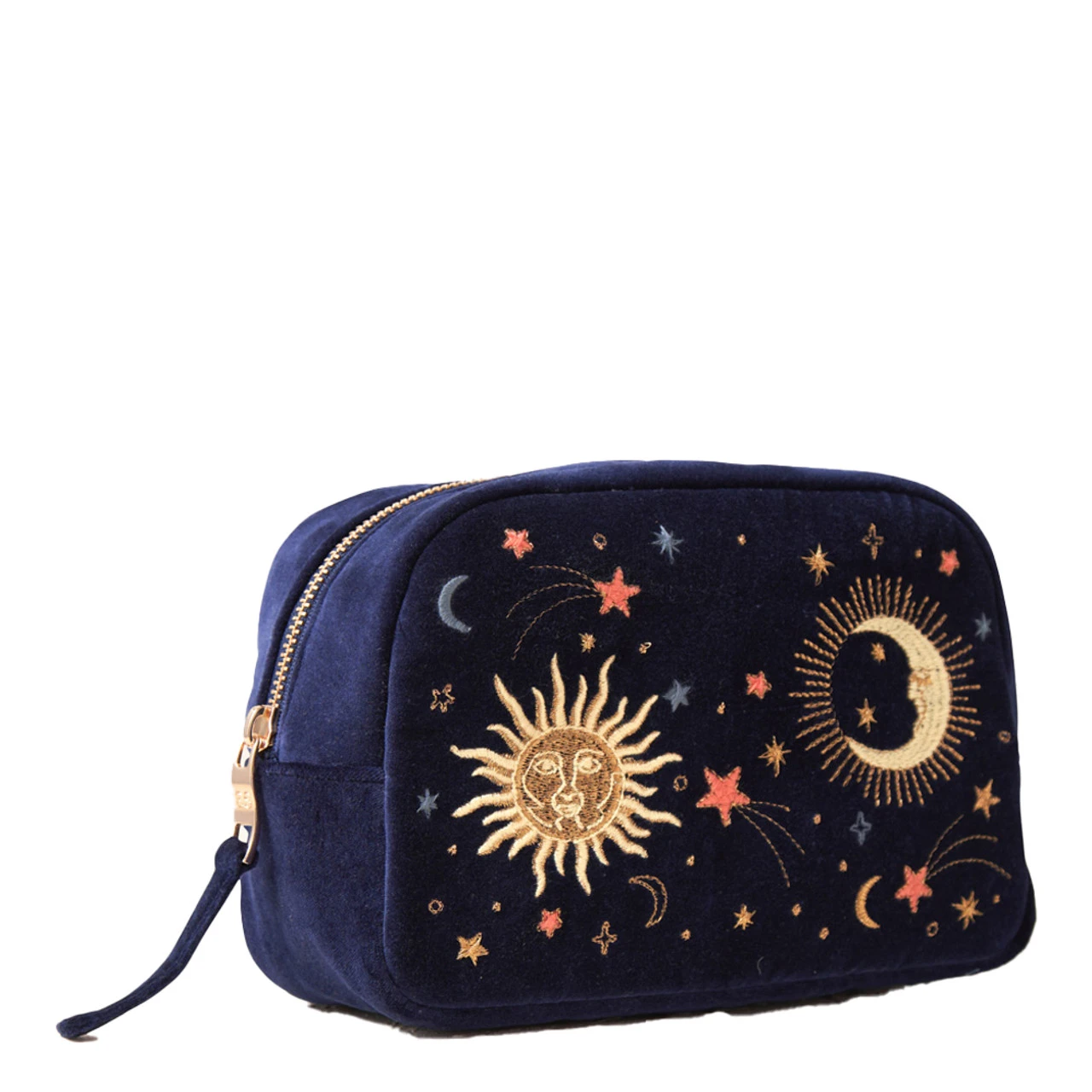 Perfect as a gift, or treat for yourself, this bag can be used for your beauty products, cosmetics, delicate pieces, jewellery, or even as a little decorative clutch bag. With a water resistant lining for any makeup mishaps or spills, it’s durable on the inside but looks stylish, and luxurious on the outside. With delicate golden moons and stars embroidered onto rich navy velvet, this is a must have accessory.Â
