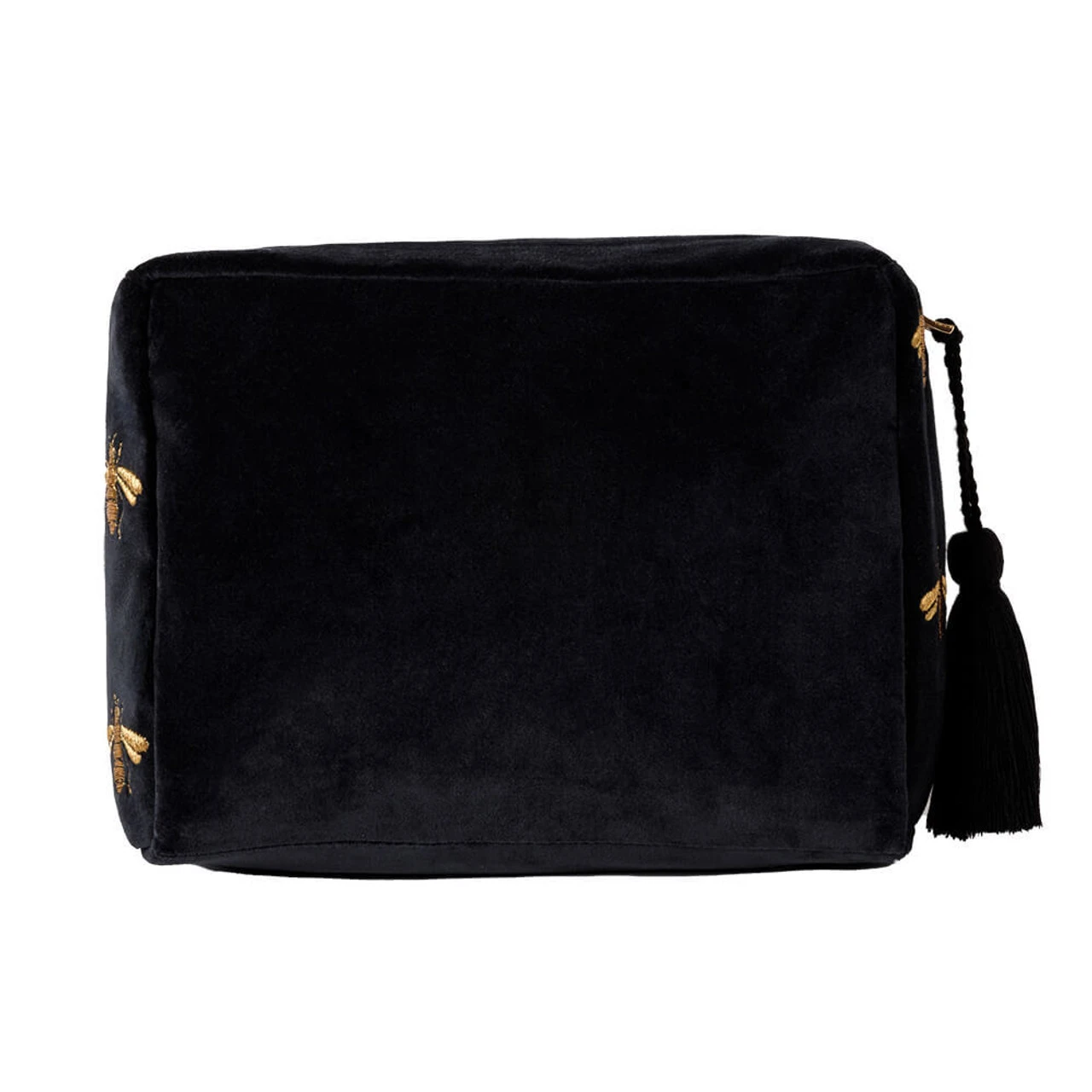 A beautiful cotton velvet wash bag featuring an intricate golden bee thread design, in a unique stylish charcoal black shade.