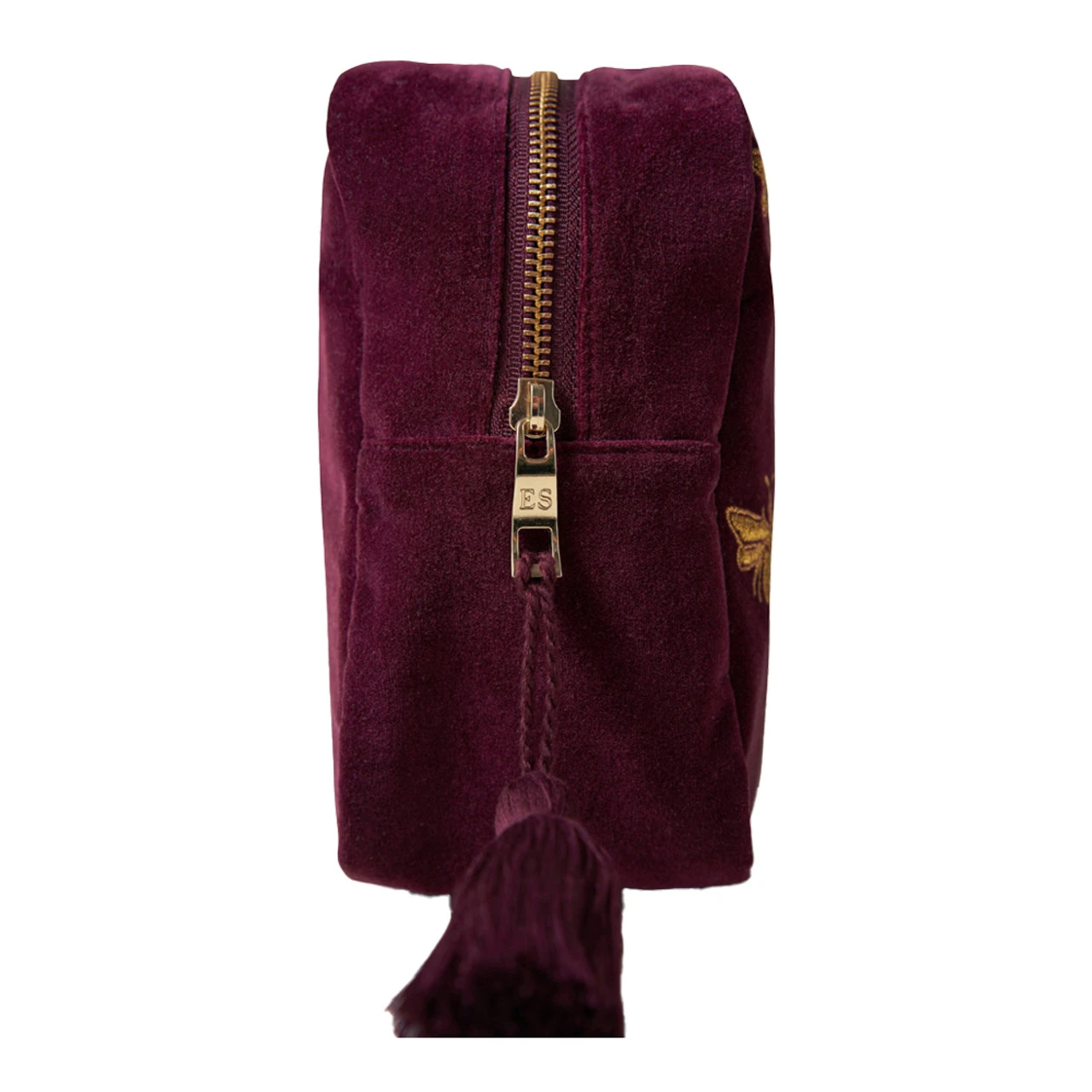 A beautiful cotton velvet wash bag featuring an intricate golden bee thread design, in a unique stylish plum-hued shade.