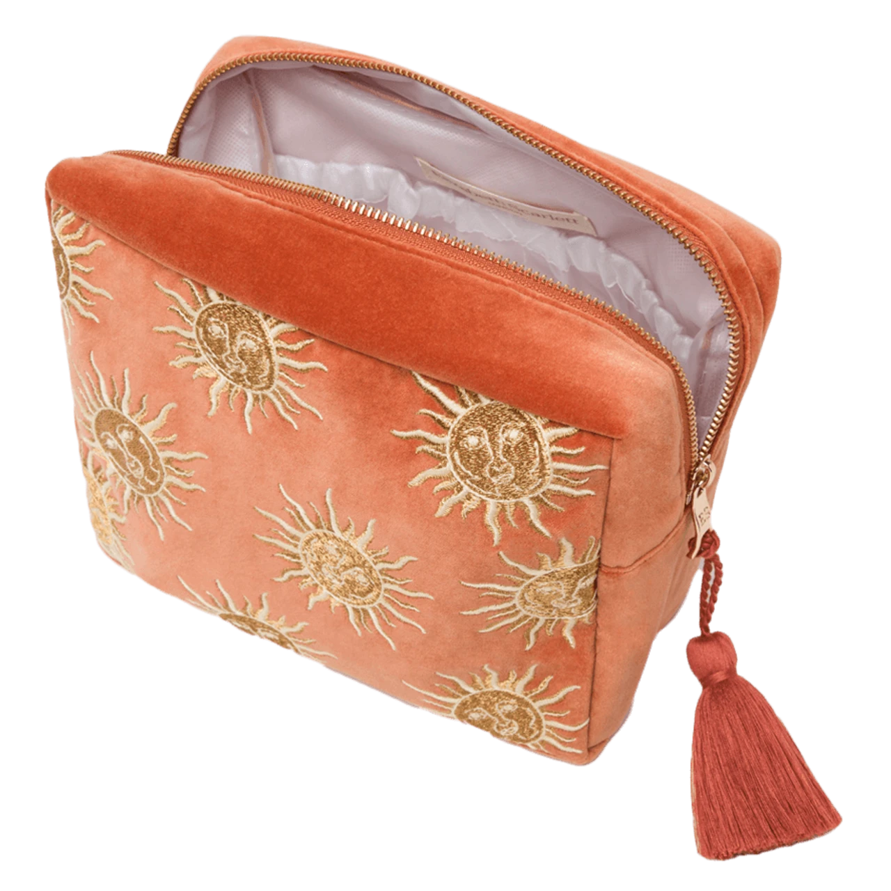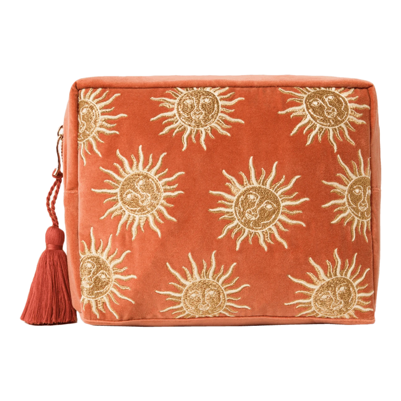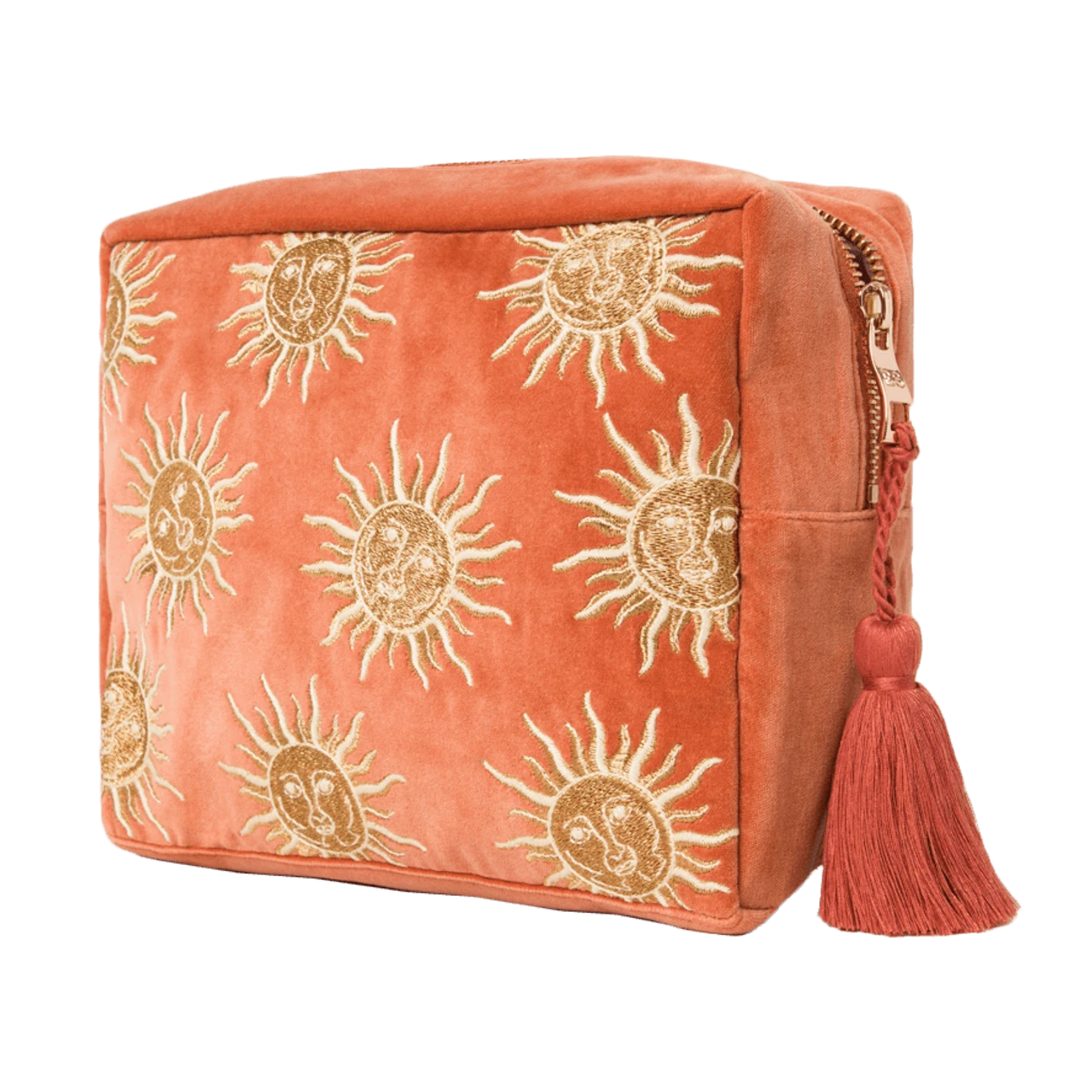 Perfect as a gift, or treat for yourself, this bag can be used for your beauty products, cosmetics, delicate pieces, jewellery, or even as a little decorative clutch bag. With a water resistant lining for any makeup mishaps or spills, it’s durable on the inside but looks stylish, and luxurious on the outside. With hand illustrated golden suns sewn into a rust orange velvet base, this is a must have accessory.Â