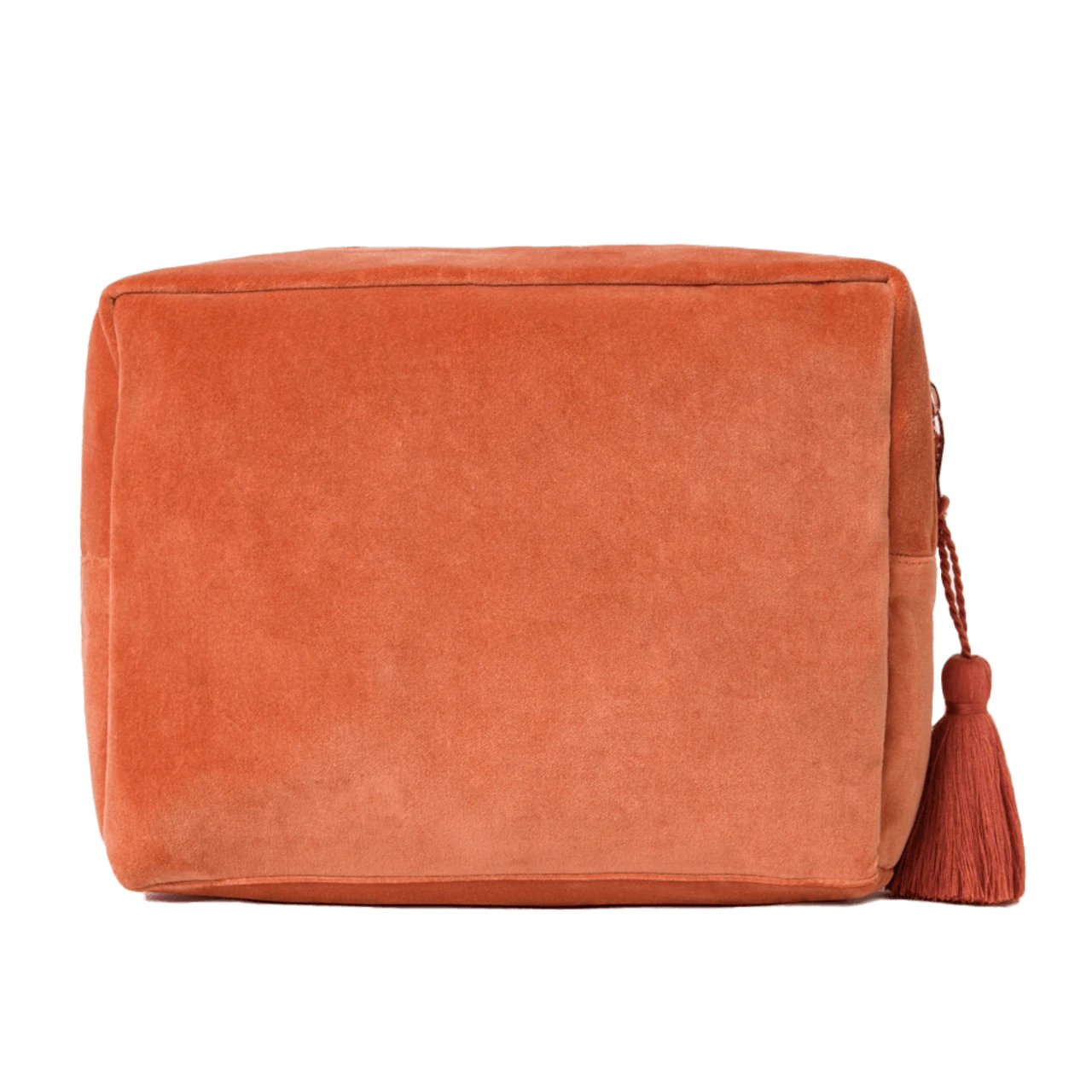 A beautiful cotton velvet wash bag featuring an intricate sun goddess thread design, in a unique stylish rust orange shade.