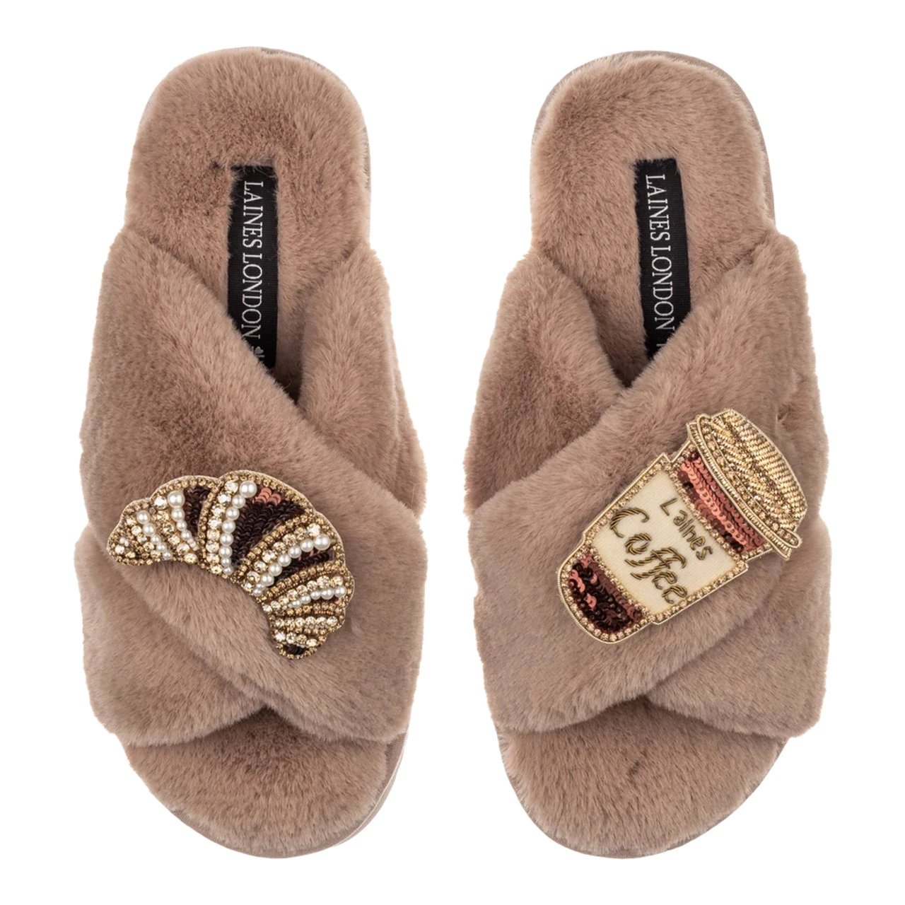 About Laines London Classic Toffee Slippers with Double Coffee & Croissant Brooch