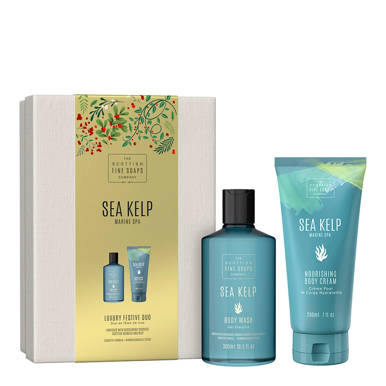 A luxurious, marine-scented duo enriched with sustainably sourced seaweed and kelp extract, presented in a luxurious gift box.Â
