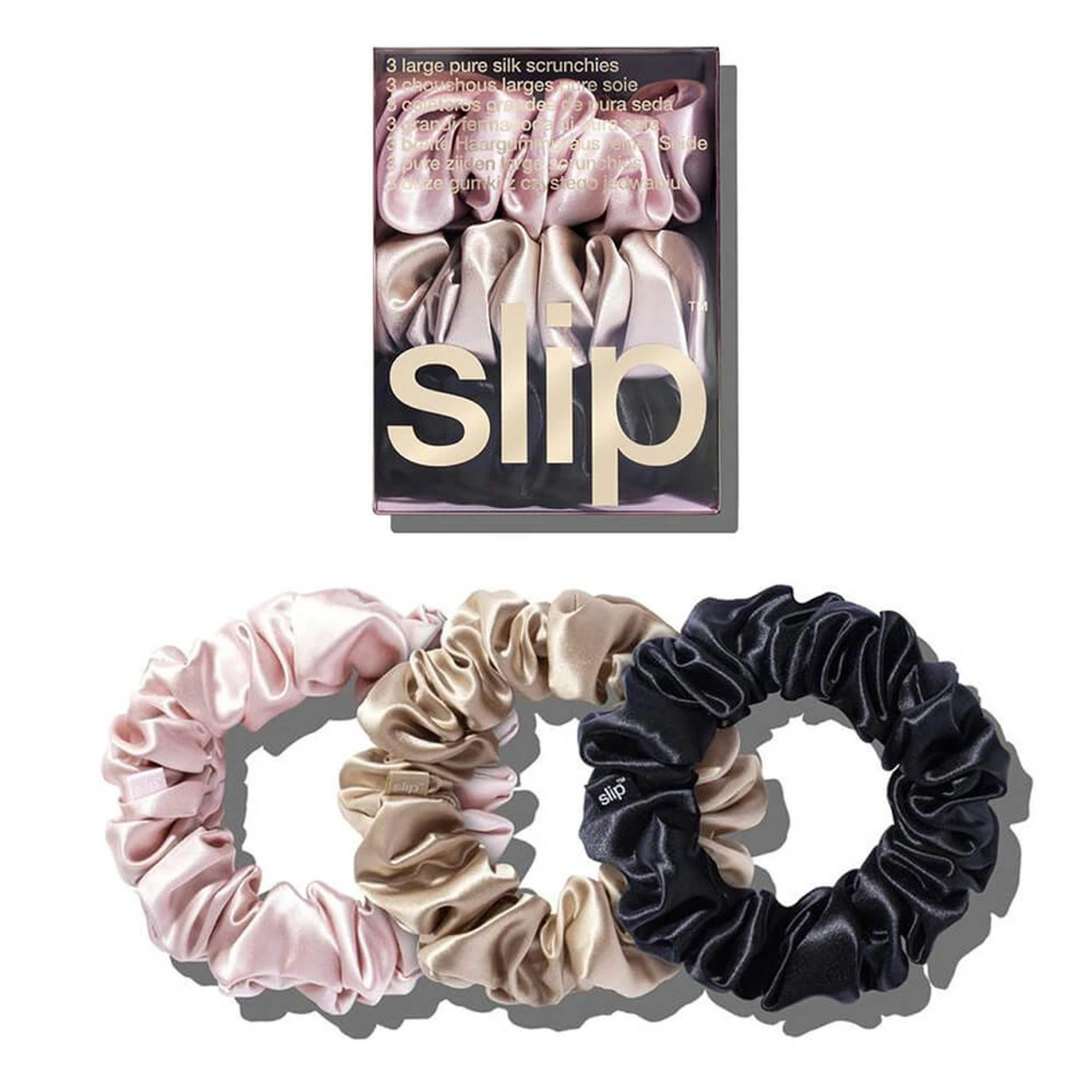 From the makers of the bestselling Slip Pure Silk Pillowcase, Slip have made luxury 100% silk (exclusive of elastic) scrunchies to help you style your hair without the worry of pulling, creasing or damaging your delicate hair. Made with the highest grade (6A) long fibre mulberry silk, these super smooth silky hair scrunchies are a great alternative to traditional hair ties which can tug, damage and cause breakage. Using the same award-winning silk as their luxury pillowcases, this pack of three large scrunchies are great for all hair types, and styles, and also make a great little wrist accessory too! Available in 3 different shades, they can also elevate your every day style.Â