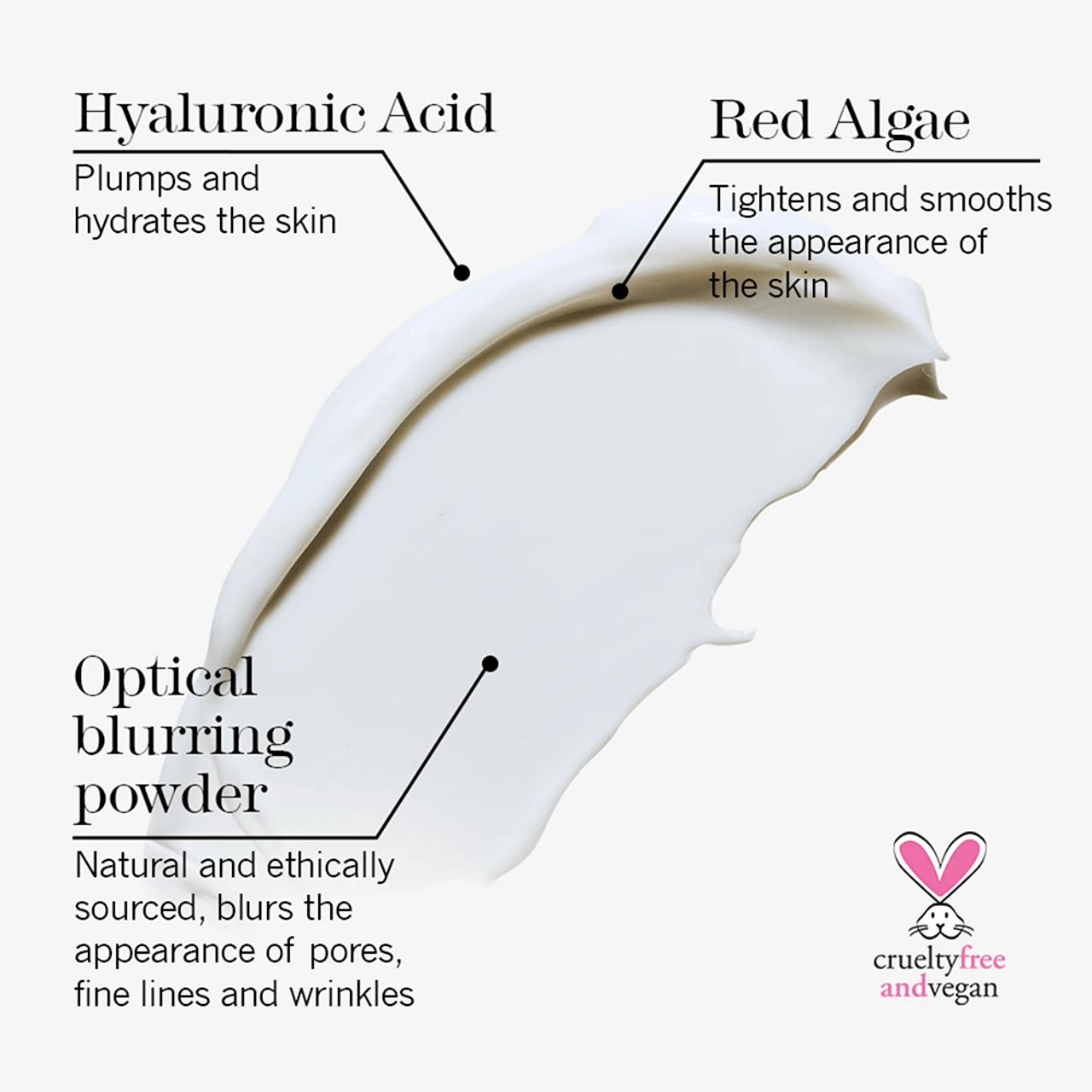 Hyaluronic acid, argan and starflower oils help repair skin and infuse it with moisture for a plumper and more even appearance. Extract of caffeine revitalises the complexion giving a bright radiant glow. Skin is left smoothed and prepped for makeup.