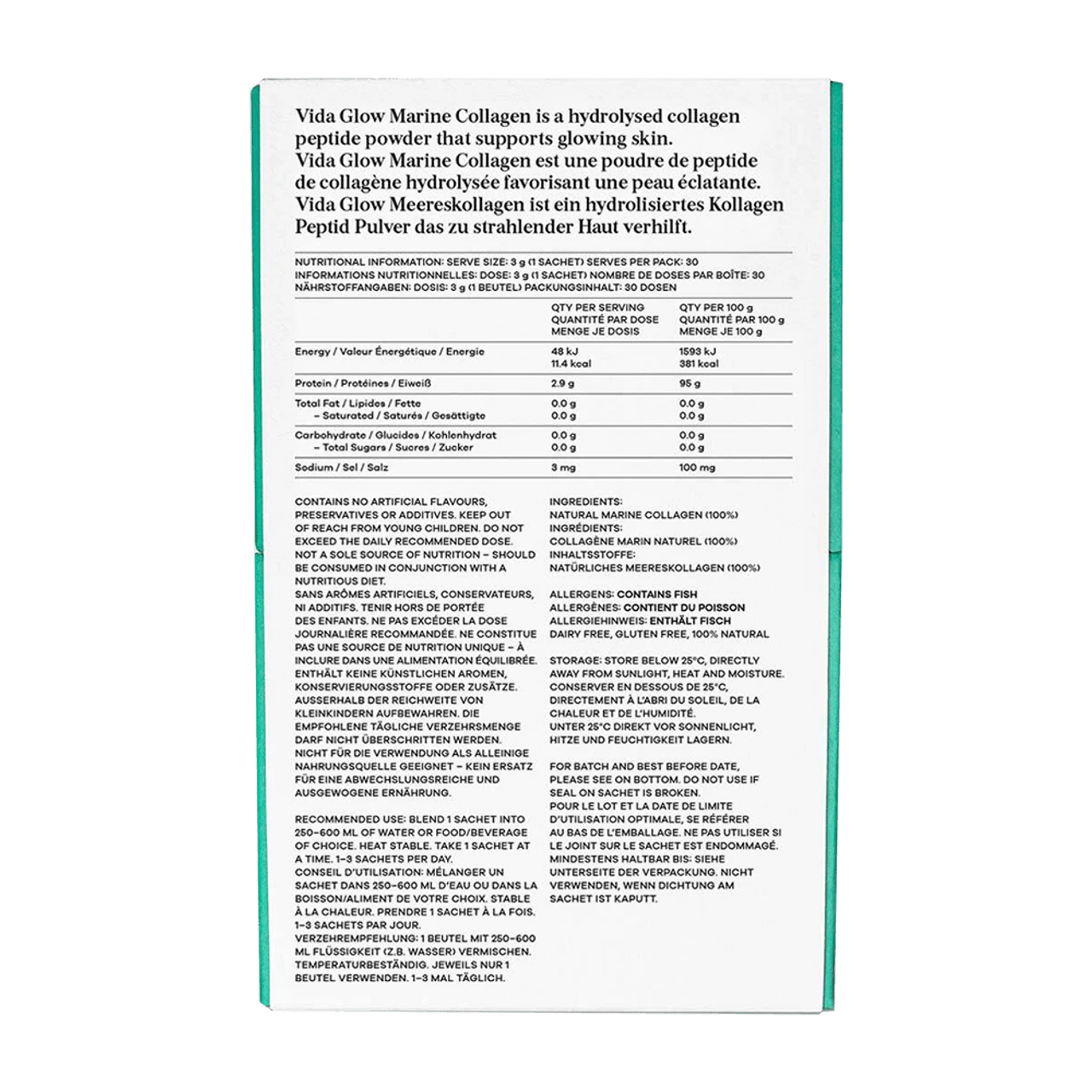Vida Glow’s marine collagen is activated through a natural hydrolysation process, so the peptides are small in weight – and high in impact. Enzymes break raw collagen down into a low-weight peptide powder (from 300,000 Daltons to as low as 2,000). It’s bioavailable with an absorption rate over 90% and highly effective.
